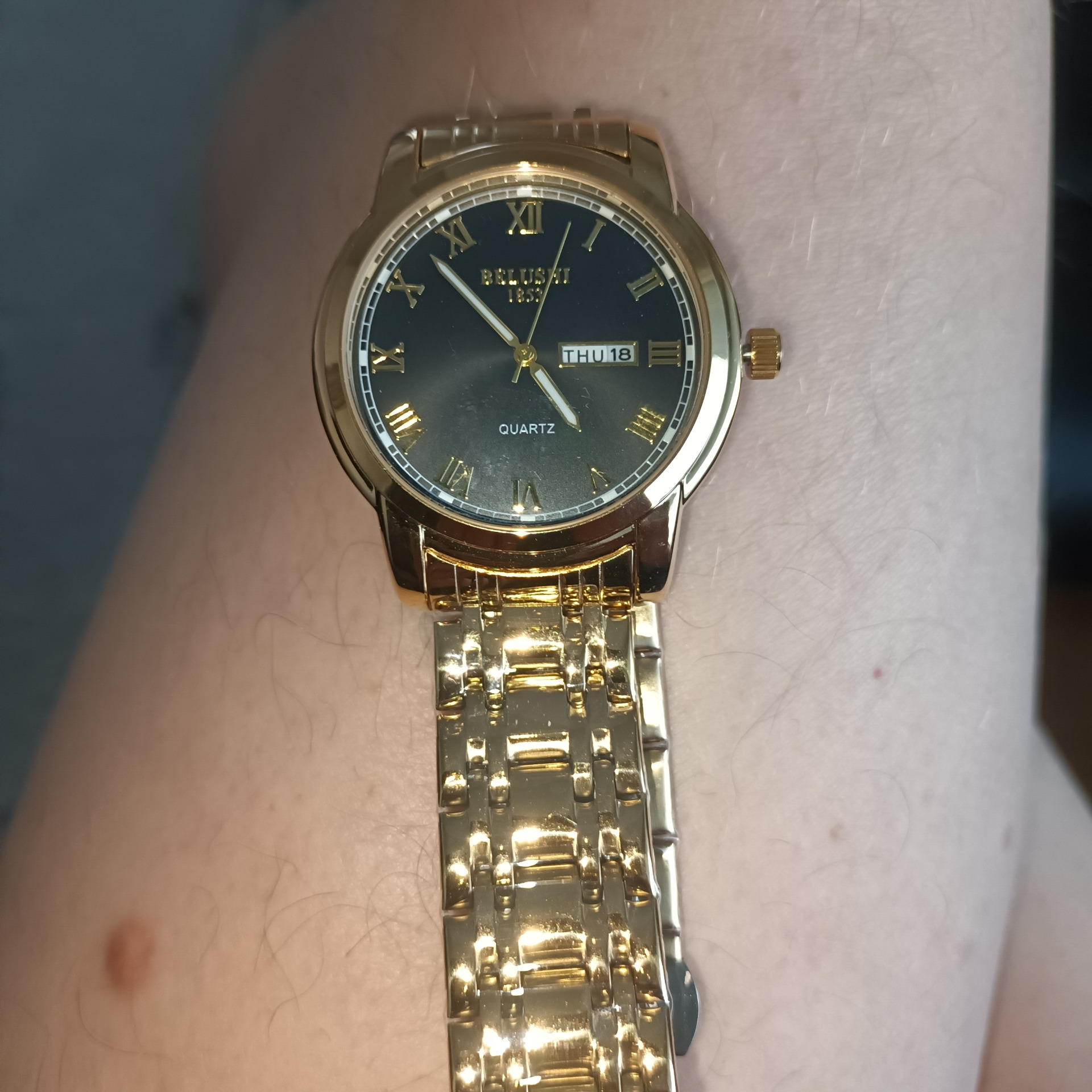 Myydään erittäin tyylikäs ja klassinen Belushi-rannekello. Kellossa on kullanvärinen runko ja ranneke, joka yhdistyy upeasti mustaan kellotauluun. Roomalaiset numerot antavat kellolle arvokkaan ja ajattoman ilmeen.