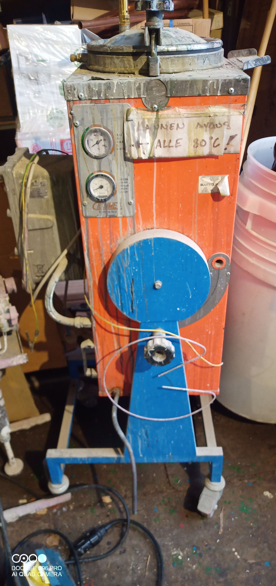 "EX" mallinimessä tarkoittaa, että laitteen sähkökeskus ja rakenne on räjähdyssuojattu (ATEX-luokiteltu), mikä on elintärkeää herkästi syttyvien liuottimien kanssa työskenneltäessä. Laitteessa on tukeva kippimekanismi (sininen sivukiekko), jolla keittokattila saadaan käännettyä ja maalijäte tyhjennettyä helposti. Laitteen kyljessä oleva tärkeä suomenkielinen varoitusteksti ("Kannen avaus alle 80°C!") muistuttaa turvallisesta käytöstä.
